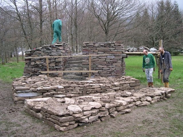 This is a grand-scale project headed by Irwin Campbell, and contributed to by 20 fellow masons: a re-creation of a 5m high section of a Scottish Broch. Brochs are dry stone structures which date back to the Iron Age and have been subject to extensive discussion and controversy . In Campbell's words "There has been much written on Brochs about the who, what, where, and when [...] However, nobody has really shown how they were built." This is what his project proposed to do, using only the tools which the original builders could have used. Campbell concluded it would take 2,500 tons of stone and a year or construction complete an 8m high broch, totaling two to three years when one considers the time needed to collect the stone. The official page contains more information about the project and Campbell. There is also a DVD available for purchase. |