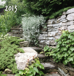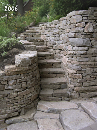 Here, I built a curving stairway and retaining walls to replace a failing, original retaining wall. Upon returning seven years after its construction, I found a functional, enduring wall that fit organically with its surroundings. |